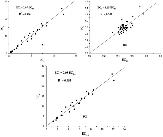 Overall, it is necessary to describe in detail the method of preparation and extraction for determining EC1:1 or EC1:5 and the range of ECe in order to properly evaluate and compare the proposed equations of ECe = f(EC1:5). Additionally, the study of soils with different characteristics than those of the group of soils examined in this work is needed.