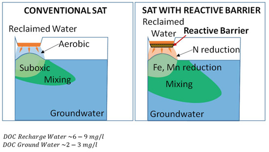 Figure 1 displays redox zonation during infiltration periods in a conventional SAT system and in a system with a reactive barrier. The source water should contain a labile DOC concentration higher than 6–9 mg/L in order to consume the oxygen and start to consume nitrate as the next electron acceptor. The implementation of the reactive barrier increases the concentration of DOC in the recharged water, so that available electron acceptors are consumed and redox zonation is developed further, reaching Fe- and Mn-reducing conditions, and hopefully SO4-reducing conditions. Conditions should return to aerobic during drying periods in both cases.
