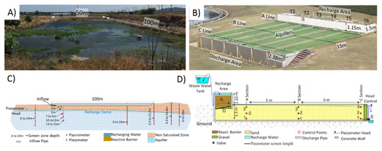 We constructed six pilot recharge systems (15 × 15 m2 excavated structures, divided into six 2.38 × 15 m channels; Figure 2B), to test the effect of the reactive barrier’s composition and the role of plants on the fate of CECs and pathogens. The system was fed with the secondary treatment effluent of the WWTP, which infiltrated from the basin through the barrier and further flowed along the 15 m simulated aquifer, to finally discharge at the base of the 1.5 m thick aquifer. Indeed, the pilot MAR operated as a tertiary treatment (Figure 2D). In this case, two organic carbon sources were tested: compost and wood chips. We assessed their performance by comparing the removal of more than 50 CEC and pathogen indicators to that of a reference system (infiltration without reactive barrier).