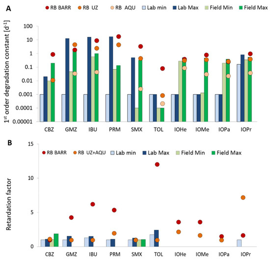 Figure 3 shows the comparison among the estimated degradation rates, λ (A), and retardation coefficients, R (B), at Sant Vicenç dels Horts and those reported from other studies carried out both in laboratory experiments and at field sites [54,55,56,57,58,59,60,61,62]. Considering the typical maximum duration for columns (1–2 years) and field experiments (10–20 years), the minimum value for λ was allowed to be 10−3, and 10−4 d−1, respectively, following the approach from Greskowiak et al. [63].