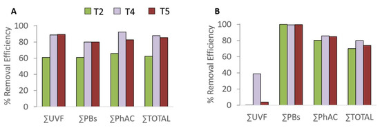Removal efficiencies for organic UV filters (ΣUVF), paraben preservatives (ΣPB), pharmaceuticals (ΣPhAC), and total CECs (ΣTOTAL) estimated at the effluent of the reference system (T2), the system operating with the reactive barrier based on compost (T4), and the system operating with the barrier based on woodchips (T5) during (A) January 2018 and (B) March 2018 recharge episodes.