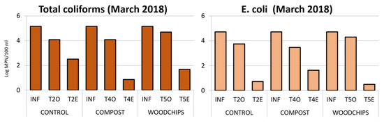 Concentrations (log MPN/100 mL) of total coliforms and Escherichia coli (E. coli)measured at the inflow (INF), immediately below the vadose zone (O-points), and effluent (E-points) of the reference system (T2, control) and the systems operating with reactive barriers based on compost (T4) and woodchips (T5) during the March 2018 recharge episode.