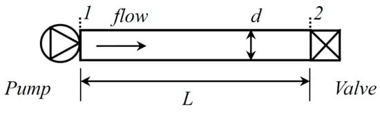 In the pump–pipe–valve system, the fluid flows from the input pump into the pipeline and goes out to the atmosphere through the ending valve. The periodic transient waves are generated via the oscillation of the cross-section of the ending valve. The diagram of the pump–pipe–valve system is shown in Figure 1, where the dimension of the pipeline is defined by the length and diameter of a single pipe. Being different from the reservoir–pipe–valve system, a reciprocating pump serves as the inlet providing a constant discharge into the pipeline. In particular, the displacement of rocker in the pump does not change with the pressure in the pipe, and, therefore, it keeps an invariable flux during the delivery stroke. Thus, the input discharge from the pump can be considered as a constant during the propagation of the transient wave in the pipeline.