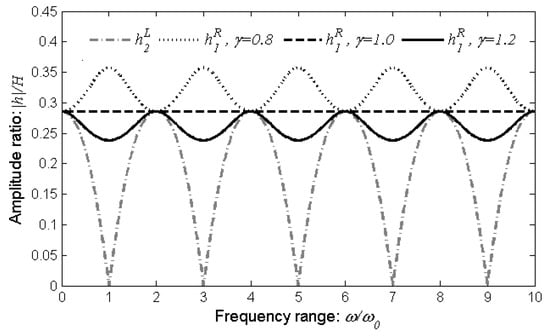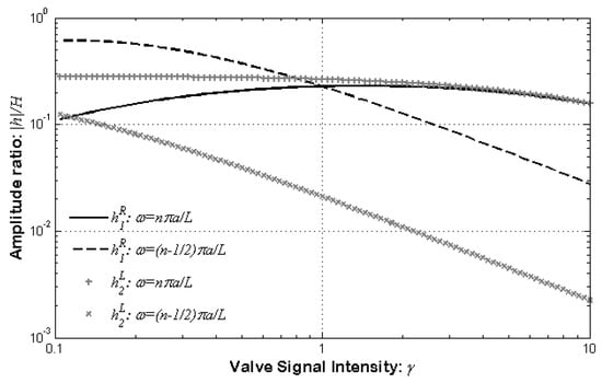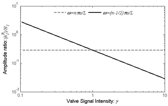 The transient waves used as communicating signals in the pump–pipe–valve system usually have requests on the signal intensity and the frequency range; thus, we should balance amplitudes of the pressure fluctuations and differences between resonances and anti-resonances to obtain high quality of communication. As seen from Equations (19)–(25), the bigger magnitude of the valve motion can lead to bigger amplitudes of pressure fluctuations. Then, the smaller value of and , caused by smaller friction factor or shorter pipe, can result in more intense oscillation, which is a similar tendency caused by the smaller VSI. However, the nonuniformity of the amplitudes increases sharply when VSI becomes smaller than one or bigger than one, as seen in Figure 3 and Figure 9. In sum, in order to obtain effective communication by periodic transient waves, making the VSI smaller than one can strengthen the amplitudes at the upstream side, while making the VSI equal to one can provide a unique amplitude for all the frequency. Besides, using a pipe of smooth internal walls is always an effective selection.