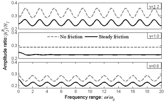 Actually, the steady friction yields a decrease of the maximums at resonances and an increase of the minimums at anti-resonances. Thus, the variation ratios of extremums can be calculated by