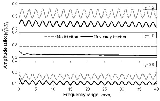 For the steady friction effects, an approximate calculation of the resonances and anti-resonances is expressed by Equations (19)–(25) with good accuracy, and it yields to the invariable extremums and resonant frequencies. The unsteady friction model is applied as well, and, further, decrease of the pressure fluctuation at a higher frequency results. It is noted that the nonlinearity of friction model is still a challenging factor for the frequency response of 1D water hammer when applied to practical problems since the high order terms will make non-negligible contributions at some specific conditions [,,]. Duan et al [] proposed a two-step analytical extension for the friction factor to consider the nonlinear turbulent friction term. The numerical results showed that the contribution of the nonlinear steady friction term to the total frictional damping was highly dependent on the ratio of the generated transient intensity to the initial pipe discharge, which provided a factor to estimate the importance of the nonlinearity on the system frequency response analysis. Creaco [] used an unsteady friction model to simulate the hydraulic process in a water-distributed network and found that it needed a long time step to obtain the effective signal of pressure head after valve variation. Nevertheless, a precise unsteady model is still needed when applied to practical problems.