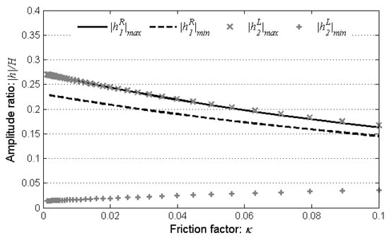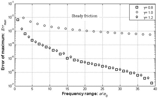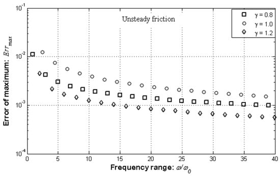 The Darcy–Weisbach steady friction model describes the friction from the internal face of the pipe with a friction factor being independent on the frequency; thus the extremums’ variations are scarcely dependent on the frequency. The conclusion is similar with the friction’s influence on the reservoir–pipe–valve system that it is verified to be too small to be neglected on the resonance frequency shift [,]. Nevertheless, the former derivation is obtained on the condition of ; thus, the approximation has big errors at low frequency according to the definition in Equation (16). These corollaries are also verified by the next example.
