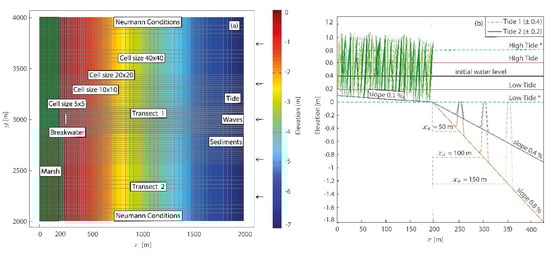 The model simulates the hydrodynamic and sediment transport processes involved in the morphological evolution of a salt marsh, in the presence of subtidal breakwater. The numerical domain is a square (2 km × 2 km), whose computational grid is composed of 147 × 143 cells, in the x and y direction respectively, which is refined gradually from the eastern side (40 m × 40 m) to the western (5 m × 5 m) (Figure 1).