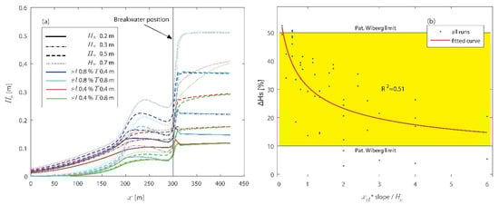 (a) Example of wave damping for the xd = 100 m configuration. Type of line changes according to the wave height, the color is relative to slope and tide. Red continuous line represents (Hs = 0.2 sl = 0.4% T = 0.4), blue continuous (Hs = 0.2 sl = 0.8% T = 0.4), cyan dashed (Hs = 0.5 sl = 0.8% T = 0.8), and so on. (b) Wave damping for all runs as function of the dimensionless variable xd*slope/Hs. Wiberg limits define the range within she measured waves damping, which are consistent with our model results.