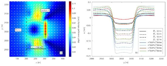 (a) Velocity field around the breakwater related to the configuration with xd = 100 m, Hs = 0.5 m and sl = 0.8%, during the tidal flood. (b) U velocity component along section A related to all runs with xd = 100 m (same reading key of Plot 2a).