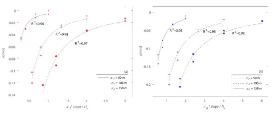 Mean u velocity during one tidal cycle measured at the center of section A, as function of the dimensionless variable xd * slope/Hs for all simulations with slope = 0.4% (a) and 0.8% (b).