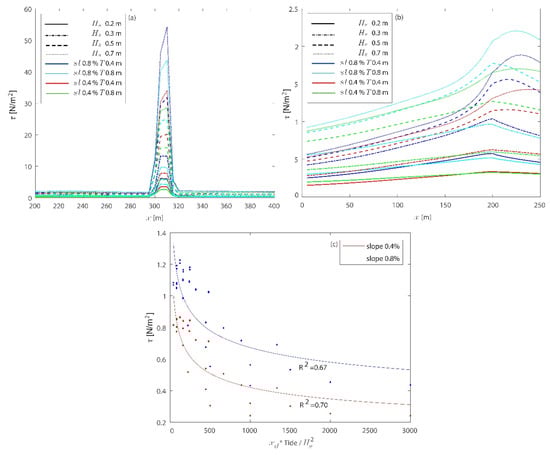 The shear stress peak due to the presence of the breakwater was clearly identified (Figure 5a), while the shear stress value into the marsh increased with wave height, slope and tide (Figure 5b). The shear stress value at the marsh scarp (x = 200 m) for all runs, as a function of xd, tide and waves, revealed how the magnitude of the shear stress was proportional to Hs and inversely proportional to xd and the tide, while the slope increasing effect augmented the erosion at the marsh edge (Figure 5c). Shear stress was correlated with the dimensionless variable for all distinct runs with slope 0.4% (R2 = 0.70) and 0.8% (R2 = 0.67).