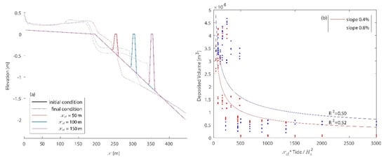 (a) Bed level profile after the end of the simulation compared to the initial condition, for the simulation with slope 0.8%, Hs = 0.5 m, Tide = ±0.2 m, Cs = 0.2 kg/m3 and D50 = 100 µm. (b) Sediment deposition into the salt marsh behind the breakwater, as function of breakwater distance from the shoreline, tide and wave height.