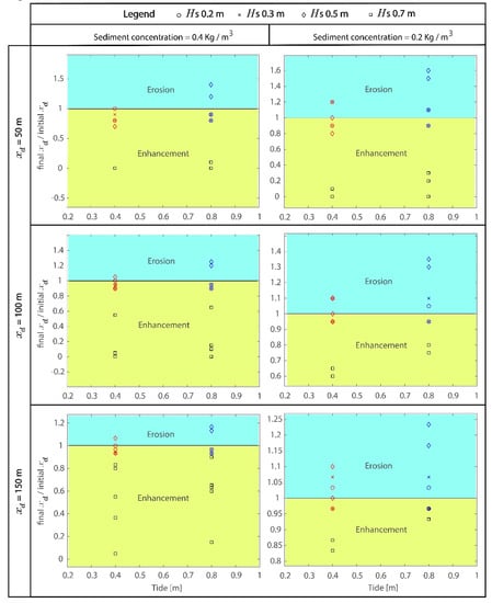 We identified and quantified several important structural (e.g., breakwater position) and environmental characteristics (wave height bathymetric slope) on sediment deposition within marshes; we calculated the deposited volume as the difference between the initial bed level and the bed level at the end of the simulation into the saltmarsh behind the breakwater, and then multiplied by the area of the cells in order to obtain the total deposited volume. The estimation was therefore punctual made cell by cell. With regards to the wave height abatement, on the other hand, an average wave damping was calculated during a tide cycle. However, the tide was found to play a dominant role in marsh erosion (Figure 7). This role was illustrated using the erosion ratio, defined as the final xd over the initial value of xd as function of the tide for all the xd, wave heights and for the two different values of concentration. We observed the tide to be strongly and positively correlated with the erosion at the marsh boundary. The erosion ratio for the 0.8 m tide condition, which reached the marsh platform at low tide, was greater than the 0.4 m tide condition, as increasing both the breakwater distance to the coastline and the wave height was observed to increase shoreline erosion. Additionally, the lower suspended sediment concentrations lead to higher erosion. It is also possible to observe how wave heights equal to 0.7 do not follow the same behavior as the other wave heights, but only cause deposition in the marsh (Figure 7). This mismatch is due to the great energy that the model develops in the presence of such waves, in environments governed by a very low energy regime.