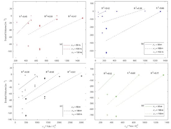 Eroded marsh volume for those configurations which cause erosion (see Figure 7), as function of the dimensionless variable xd*Tide/Hs2. (a) slope = 0.4% and Tide = ±0.4 m (b) slope = 0.8% and Tide = ±0.4 m (c) slope = 0.4% and Tide = ±0.8 m (d) slope = 0.8% and Tide = ±0.8 m.