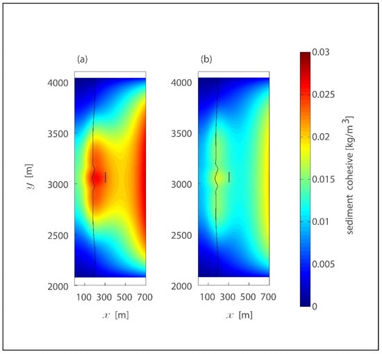 We provided an example of cohesive sediment concentration distribution at the end of the simulation around the breakwater area, for the run with Hs = 0.5 m, slope = 0.8%, Tide = ±0.4 m and xd = 100 m, for the two sediment concentrations (a) 0.4 kg/m3 and (b) 0.2 kg/m3 (Figure 9). The simulation demonstrated that the higher sediment concentration (Plot a) allows more sedimentation in the area protected by the breakwater and into the marsh.