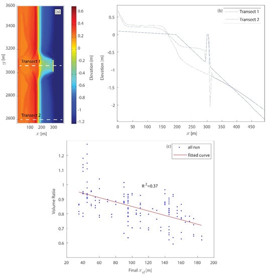 We compared two 100 × 200 m check volumes, centered on transect 1 and 2 into the salt marsh (Figure 10a,b). In particular, we highlighted the ratio between the sediment accumulation behind and far away from the breakwater, into the marsh, as function of the final breakwater distance to the shoreline (Figure 10c). Volume ratio was defined as the ratio between the deposited volume on transect 1 over the deposited volume on transect 2, into the salt marsh. For most of runs the volume ratio was lower than 1 (Figure 10c), meaning that sediments were blocked by the breakwater, while without breakwater more sediments are allowed to reach the marsh.