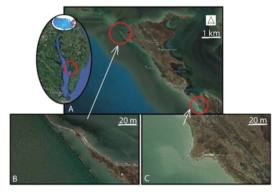 Example of failing breakwaters use in Chesapeake Bay, US. (A) Eastern Shore of Maryland, (Hoopers Island), (B) and (C) shows failing coastal structures like breakwaters and submerged Riprap. Signs of erosion are evident in the back-marsh area.