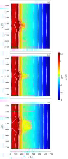 The bottom stress was modelled with Chézy’s formulation. We used two different values of this parameter, one for the bed level of the domain (CD = 60) and one for the breakwater roughness (CD = 20). The initial condition of the models consisted of an initial water level fixed at 0.4 m. The suspended sediment eddy diffusivities were a function of the fluid eddy diffusivities and were calculated using horizontal large eddy simulation and grain settling velocity. The horizontal eddy diffusivity coefficient was defined as the combination of the subgrid-scale horizontal eddy viscosity, computed from a horizontal large eddy simulation, and the background horizontal viscosity, here set equal to 0.001 m2/s2 [,]. To satisfy the numerical stability criteria of Courant Frederichs–Levy, we used a time step Δt = 3 s []. To decrease the simulation time, a morphological scale factor of 50 was used in our models (a user device to multiply the deposition and erosion rate in each Δt). A sensitivity analysis showed that a morphological factor of 50 was acceptable.