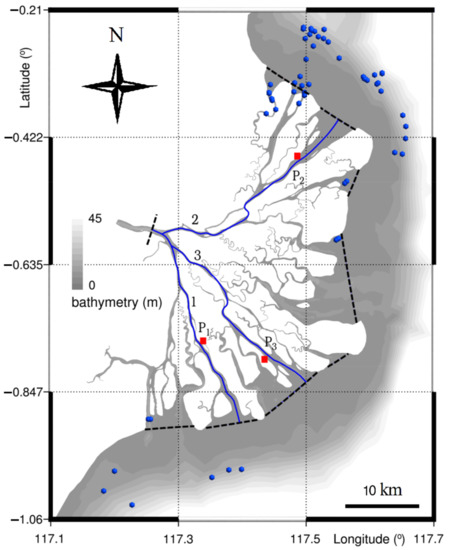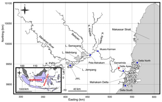 The domain of interest is the fluvial and tidal Mahakam Delta located at the mouth of the Mahakam River in the East Kalimantan province of Borneo, Indonesia (Figure 1). The delta includes a number of narrow and meandering channels. The width of the deltaic channels varies widely from 10 m to 3 km, while the depth ranges from 5 to 15 m. The delta discharges into the Makassar Strait, whose width varies between 200 and 300 km, with a length of about 600 km. Upstream of the delta is the Mahakam River, whose depth exhibits a large variability, with a maximum of the order of 45 m. The region of the river is characterized by a tropical rain forest climate with a dry season from May to September and a wet season from October to April. The river meanders over 900 km, and its catchment area covers about 75,000 km2, with a mean annual river discharge of the order of 3000 m3/s [32]. The central part of the river, located about 150 km upstream of the delta, is extremely flat. In this area, four large tributaries (Kedang Pahu, Belayan, Kedang Kepala, and Kedang Rantau) contribute greatly to the river flow, and several shallow-water lakes (e.g., Lake Jempang, Lake Melingtang, and Lake Semayang) are also connected to the river via a system of small channels. The water depth in these shallow-water lakes is of the order of 5 m.
