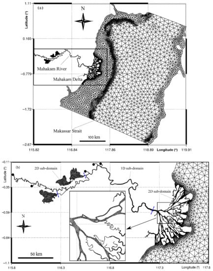 - De Brye, B.; Schellen, S.; Sassi, M.; Vermeulen, B.; Karna, T.; Deleersijder, E.; Hoitink, T. Preliminary results of a finite-element, multi-scale model of the Mahakam Delta (Indonesia). Ocean Dyn. 2011, 61, 1107–1120. [Google Scholar] [CrossRef]