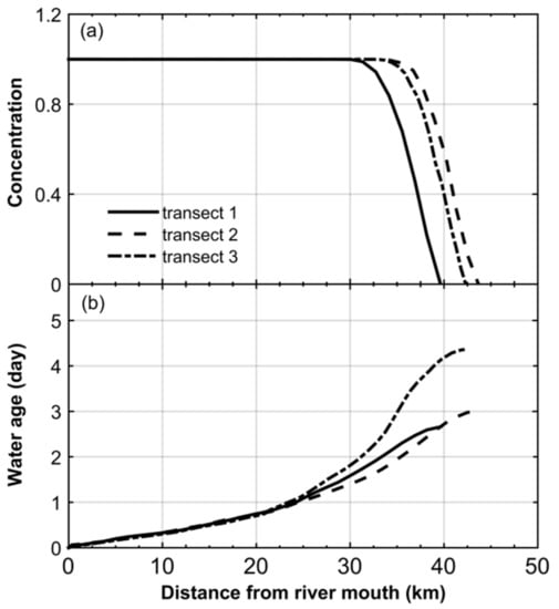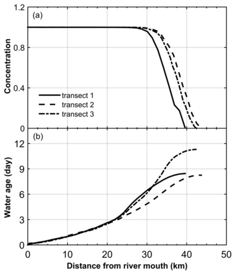 Figure 4 shows the average over the low-flow simulation period (the daily water discharge at river mouth varies from 550 to 3000 m3/s) of the concentration and the age of the river water along the three considered transects (see Figure 3). The river water concentration is equal to unity at 26 km from the river mouth (Figure 4a). Beyond this point, the concentration significantly decreases from unity to zero, resulting in a significant increase of the age of water. As shown in Figure 5a, a similar trend of the concentration is also observed for the high-flow period (during which the daily water discharge at the river mouth varies between 3500 and 6500 m3/s). The point from which the concentration begins to decrease occurs around km 31. The difference in location of the point from which the concentration starts decreasing in the low and high flow conditions can be explained by differences of water discharges.