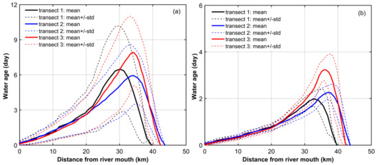 The averaged value of the water age in the high flow period also increases from zero (at the river mouth) to 4.5 days (at the downstream boundary, Figure 5b), revealing that the magnitude of the age in the high flow is three times smaller than that in the low flow. This is due to the significant increase of the flow velocity. These results reveal that the age of water is clearly linked to the river volumetric flow rate entering the delta. The standard deviation associated with the averaged value of the age of water increases from zero to 15 h along the transects, showing that the variation of the age due to the tidal variation equals 15% of the averaged value of the age, and, as expected, tidal effects on transport processes are weaker in the high flow than in the low flow regimes.