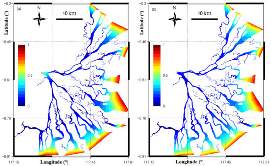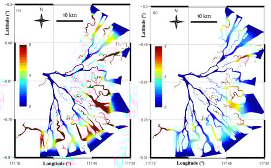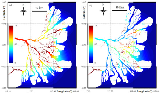 The hydrodynamic simulation tool applied herein to the Mahakam river–sea continuum is almost similar to that described in a previous study [36]. Therefore, it is not necessary to give additional pieces of information on this. It may, however, be appropriate to stress that a thorough calibration of the Chézy-Manning coefficient was achieved, leading to the following results: (i) a constant value of 0.023 (s/m1/3) for the Makassar Strait, (ii) a linearly increasing value in the delta region, from 0.023 (s/m1/3) in the coastal region to 0.0275 (s/m1/3) in the region from the delta front to the delta apex, (iii) a constant value of 0.0275 (s/m1/3) in the Mahakam River and its four tributaries, and (iv) a larger value of 0.0305 (s/m1/3) in the lakes.