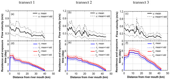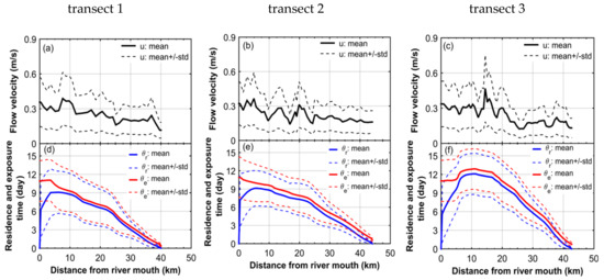 In each transect, the residence time does not monotonically decrease with the distance in the seaward direction for either the low or the high flow periods. The variation of the residence time coincides with the changes of the longitudinal velocity (see Figure 8a–c and Figure 9a–c). This result confirms again that the residence time is a useful measure of the influence of the flow dynamics on transport processes [21].
