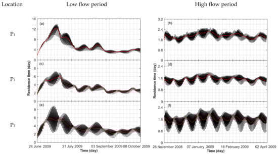 Simulated values of the residence time at the: (a) P1; (b) P2; (c) P3 (see Figure 3) for the low period and simulated values of the residence time at the: (d) P1; (e) P2, (f) P3 for the high flow period. In each panel, the back line indicates the instantaneous value, while the red curve presents the averaged value over 24 h taken to filter out tidal oscillation.