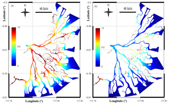 Distribution of the exposure time in the whole delta for the: (a) low; (b) high flow period. The color bar is cropped at 13 days in order to focus on the variation of the exposure time in deltaic channels and the unit is day.