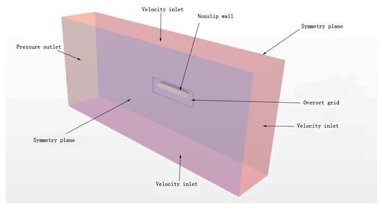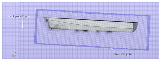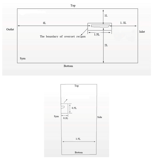 The definitions of boundary conditions in the domain are presented as follow: in the background region, the inlet, top and bottom are defined as the velocity inlet; the outlet is defined as the pressure outlet; and the sym and side are defined as the symmetry plane. In the overset region, all the boundaries of the region are defined as the overset grid, and the surface of the hull is defined as the nonslip wall. The definition of the boundary conditions and the setting of the calculation domains are illustrated in Figure 6.