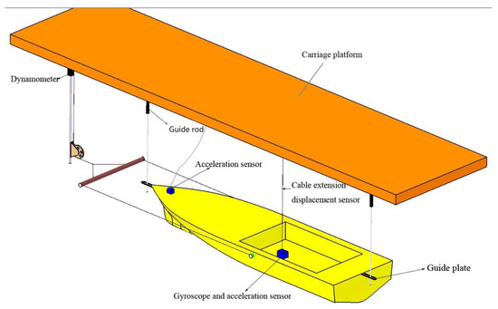 The setup of test is presented in Figure 3. All the experimental installations were installed under the carriage platform, and the guide rods are inserted into the guide plates, which were set at the bow and stern to ensure stability in the drag. In this way, the yaw and roll motions are prevented, and the heave and pitch motions of the model are free. The resistance is measured by a dynamometer in the front of the model, the pitch angle is measured by a gyroscope, which is set at the center of gravity, the heave is measured by the cable-extension displacement sensor, which is set on the above model, and the acceleration of the CG and bow of the model are measured by two acceleration sensors, which are set at the center of gravity and 0.275 m from bow. A snapshot of the model is presented in Figure 4.