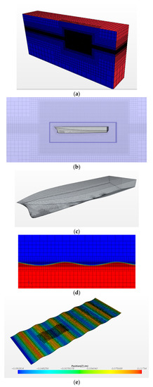 For a better accuracy, the boundaries of the calculation domain were set far enough away to reduce the reflection of waves, and the entire computational domain should be no less than five times the wave length in the navigation direction. To improve the computing efficiency, only half of the model was built for the simulation. The definition of the boundary conditions and the size of domains are illustrated in Figure 5 and Table 3, respectively.
