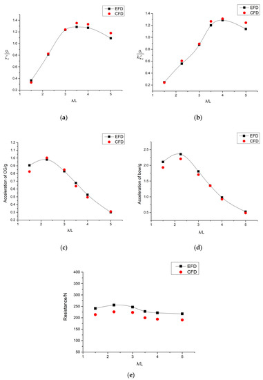 Comparison of the numerical and tested results: (a) Amplitudes of the heave; (b) Amplitudes of the pitch; (c) Amplitudes of the acceleration of the CG; (d) Amplitudes of the acceleration of the bow; (e) Average values of the resistance.