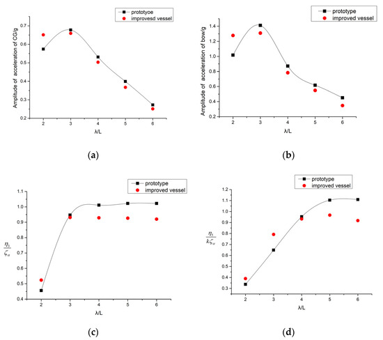 Figure 16 indicates that the motion tendency of the prototype and improved vessel are similar: As the wave length increased, the amplitudes of the pitch and acceleration began to decrease gradually after reaching the resonance region, while the amplitudes of heave tend to remain stable.