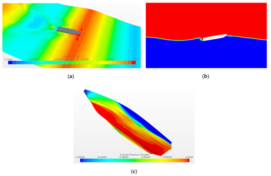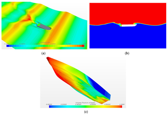 The simulation of the sailing of an improved vessel in the hull-borne status: (a) Free surface; (b) Gas–liquid phase diagram; (c) Free surface representation of the hull.
