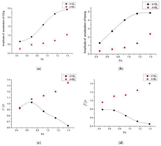 In terms of the acceleration, the influence of the speed in different navigation configurations is quite the same, while in the wave-piercing status, the influence of the speed on the acceleration is more obvious. The amplitudes of the acceleration of the vessel increase with the increasing of the speed in any condition, and the increase will become sharp at a high speed. The amplitudes of the acceleration of the vessel in the wave-piercing status (λ/L = 3) are always larger than that in the hull-borne status (λ/L = 6). This shows that in the wave-piercing status, the pitching motion is more intense, and the nonlinear characteristics of the motion increase. The influence of the speed on the acceleration of CG and bow is consistent. However, the amplitude of the acceleration of the bow increases quite sharply as the speed continues to increase, indicating that the nonlinear characteristics of the motion of the bow at a high speed increase sharply, which will greatly endanger the navigation safety.