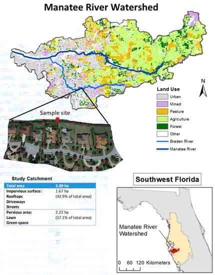 The study site is located in Manatee County, Florida, United States, and is a part of the increasingly urbanized west–central region of the state (Figure 1). The total land area of Manatee County is 2312.9 km2, of which 16.9% is water. The study site is a low-density residential catchment of 3.89 ha (or 38,900 m2) and includes 13 single-family homes (see Supplementary Information Figure S1). The research catchment drains to the Braden River, which is a tributary of the Manatee River and flows 72.4 km toward the Southern Tampa Bay, forming the Manatee River Watershed [18]. Geographic information system (GIS) was supplemented with ground-truthing, to calculate the surface area coverage of the residential catchment (Table S1). In the catchment, total pervious area is 57.1% (2.22 ha), which includes green space that consists of tree canopy (6.2%) and lawns that consist of turfgrass (50.9%). Similar to other developed suburban areas in Florida, the turfgrass in the residential catchment is predominantly St. Augustine (Stenotaphrum secundatum). On the other hand, the total impervious surface in the catchment is 42.9% (1.67 ha), which includes the area under single-family homes, i.e., rooftops, patios, driveways (18.5%), and roads and sidewalks (24.4%). The residential catchment is managed by the Lakewood Ranch Homeowners’ Association (HOA).
