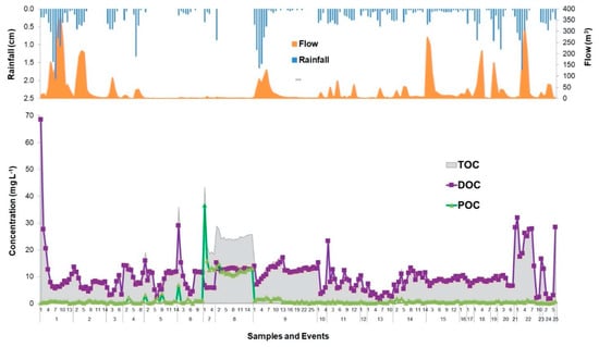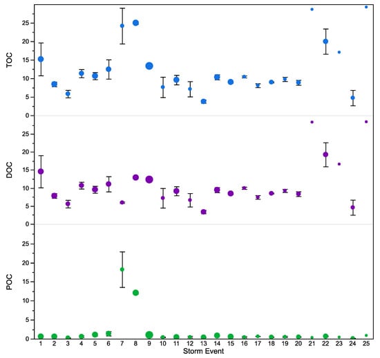 Concentrations of DOC, POC, and TOC showed temporal variation in the stormwater runoff samples collected at 10 min intervals (Figure 2) and between storm events over 25 storm events, due to the variable rainfall and runoff flows (Figure 4). Figure S3 shows the relationship between DOC and POC with rainfall and flow in the eight longest storm events. Despite the high variability in concentrations of DOC (3.37 to 28.40 mg L−1) and POC (0.41 to 18.23 mg L−1), a distinct temporal pattern was observed in the dataset, as the highest concentrations were evident shortly after the initiation of storm events, suggesting an initial flush of OC in stormwater runoff. The high concentration was generally followed by a gradual reduction, especially during prolonged storm events, indicating exhaustion of terrestrial OC sources in the residential catchment (Figure S3).