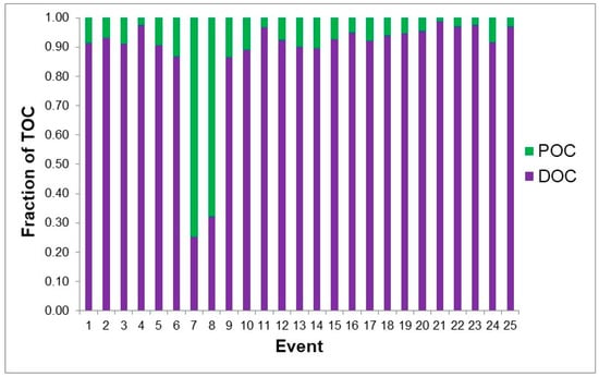 A comparison of OC forms in the stormwater runoff with Florida urban surface water bodies indicated that DOC concentrations in stormwater runoff (10.51 ± 6.20 mg L−1) were within the range typically observed (5 to 16 mg L−1) in various water bodies in Florida (Table S3). Among OC forms, concentrations of DOC were significantly higher than POC in more than 90% of storm events, with DOC: POC of 9:1 (Figure 3). Wetzel et al. [3] observed that DOC: POC is commonly 10:1 in surface runoff waters, while Alvarez-Cobelas et al. [27] reported that DOC: POC is highly variable. We suggest that higher rainfall and temperature in Florida are likely drivers of higher DOC in stormwater runoff. Research has shown that temperature and precipitation influence DOC concentrations in surface waters and that areas with warmer and more humid climate are more likely to have higher DOC in surface water bodies, as a result of the increase in ecosystem productivity and metabolic rates [28].