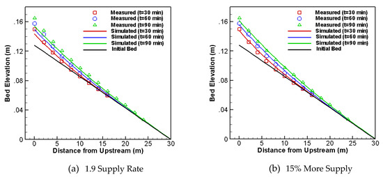 A comparison of the simulated and measured bed elevation changes in time is shown in Figure 2a. Overall agreement is fair, but the model under-predicts the aggradation at a late time (e.g., at 90 min). This may be due to the high uncertainty of the measured data. Soni [52] reported that up to 15% of errors existed in the rate of sediment addition at the upstream. Another run is made by using a higher sediment supply rate to check the model sensitivity to the supply rate. The rate is increased by 15% and the results are recomputed as shown in Figure 2b. A much better agreement is obtained. In the present modeling the Engelund-Hansen capacity equation is adopted.