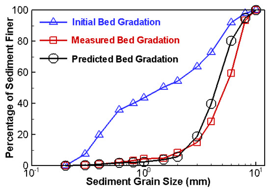 The flume used in the experiment was rectangular; it had the width of 0.8 m, length of 20 m, and bed slope of 0.01. The flume bed was filled with non-uniform sediments—a mixture of sands and fine gravels ranging from 0.2 to 10.0 mm in size. The sediment mixture had a medium diameter of 1.5 mm and a standard deviation of 3.47 (Figure 3 shows the initial bed gradation). The simulated case has a constant clear water flow of 0.0314 m3/s, an average velocity of 0.654 m/s, and water depth of 6.0 mm at the downstream boundary.