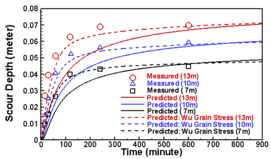 Comparison of predicted and measured scour depth variation in time at three locations: 13 m (red), 10 m (blue), and 7 m (black) from the downstream model boundary; “Measured” = Ashida-Michiue [53]; “Wu Grain Stress” = the results obtained with the modified grain shear stress calculation.