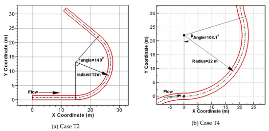 Two bend flows, reported by Struiksma et al. [54], are used to validate the ability of the new model to simulate erosion and deposition in stram bends. One is case T2 with a 140° bend filled with uniform sediments; the other is case T4 with a 108.1° bend filled with non-uniform sediments. The geometry of the two bends is shown in Figure 5. Both were tested at the Delft Hydraulics Laboratory: T2 used the DHL curved flume and T4 used the Waal Bend flume.
