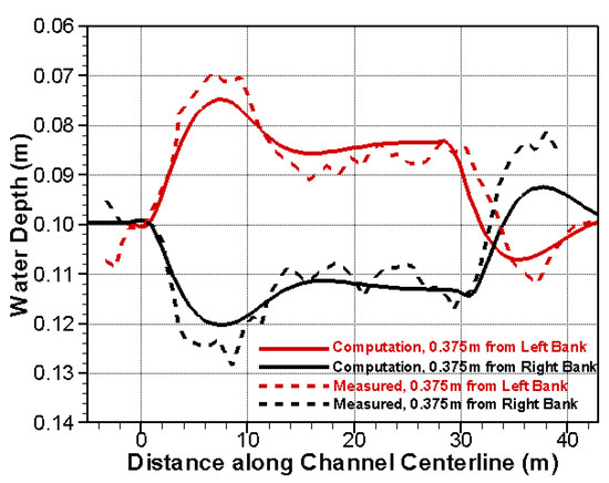 The equilibrium bedform is obtained after about 10 hours and plotted in Figure 8. A comparison of the computed and measured equilibrium water depth and medium sediment diameter () is shown in Figure 9 along two profiles: 0.11B from the inner and outer banks (B = 2.3 m is the channel width). A comparison with the measured data shows that the new model is capable of predicting the pool and bar formation as well as the sediment sorting process. Overall agreement between the model and measured data is good.
