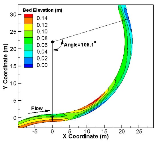 Next, case T4 is simulated: it consisted of a bend with a circular arc of 108.1o turn and 41.5 m in length. Both the entrance and exit of the bend have a section of the straight channel attached. The radius of the arc from the centerline was 22 m. Initial bed had a slope of 0.128% longitudinally but flat laterally. The bed was covered with non-uniform mixtures having mm. Some characteristic parameters of the case are listed in Table 3.