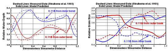 Comparison of computed and measured water depth (left) and (right) along the lines 0.11B from the inner and outer banks for case T4 of Struiksma et al. [54].