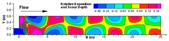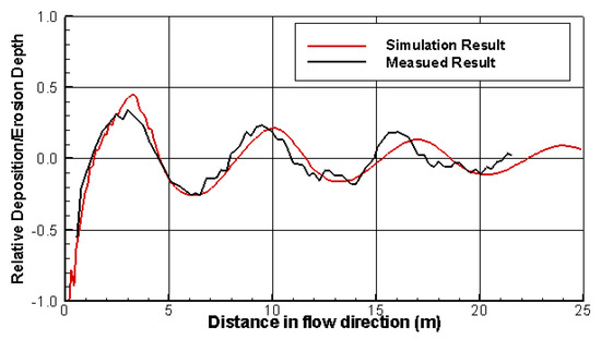 Comparison of predicted and measured erosion and deposition depths along a straight line of y = 0.1 m; depth is normalized with the average water depth of 0.044 m.