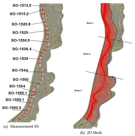 (a) Cross sections (XS) of the field measurement. (b) The 2D mesh for the numerical modeling (flow is from top to bottom, or North to South).